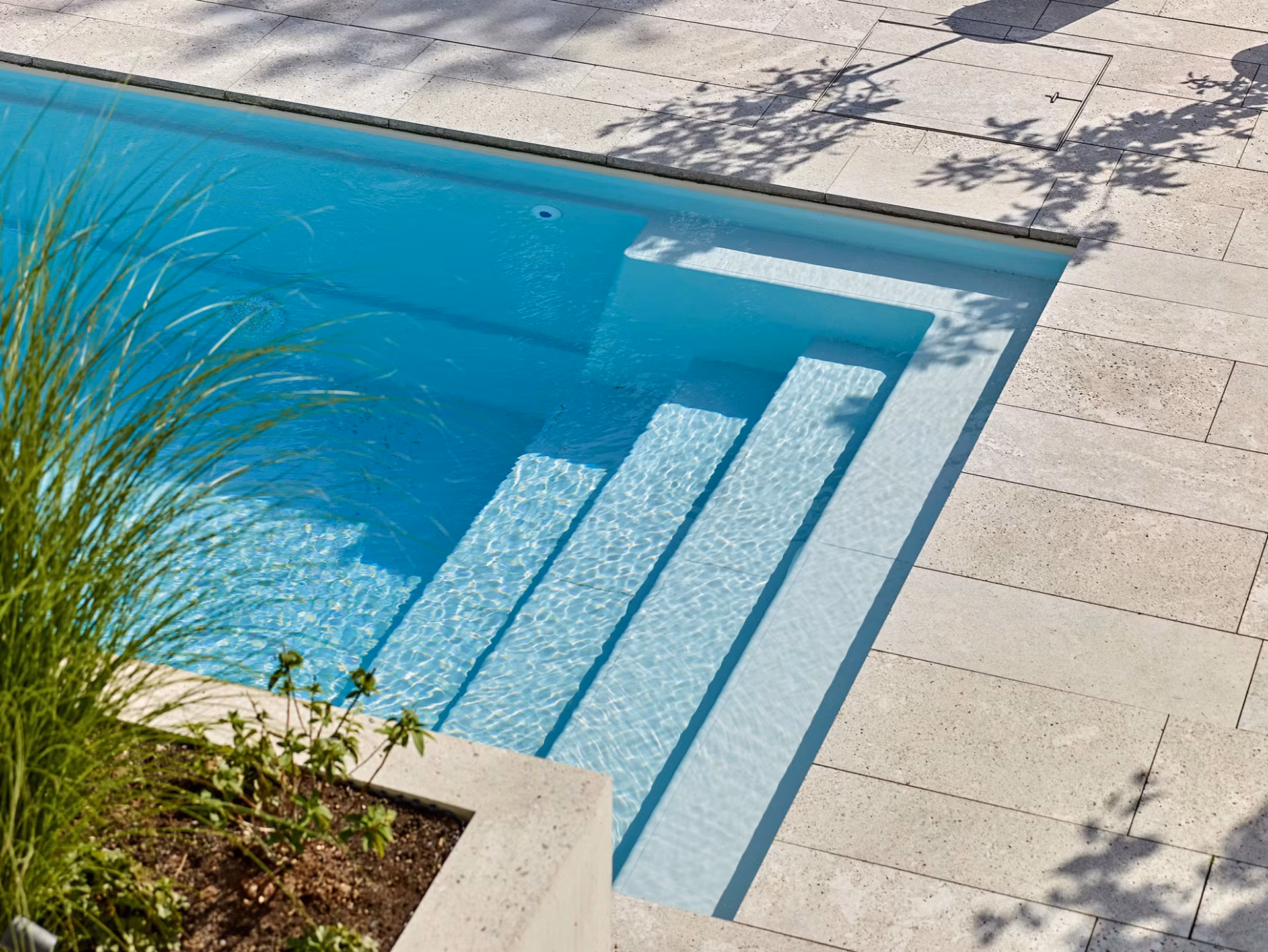 Denna modell är en pool med en genuint minimalistisk design. Trapporna är bekväma och mycket praktiska. De två första stegen erbjuder extra yta för att sitta, men de är måttligt stora, vilket gör att ingen sittbänk tar upp extra utrymme.