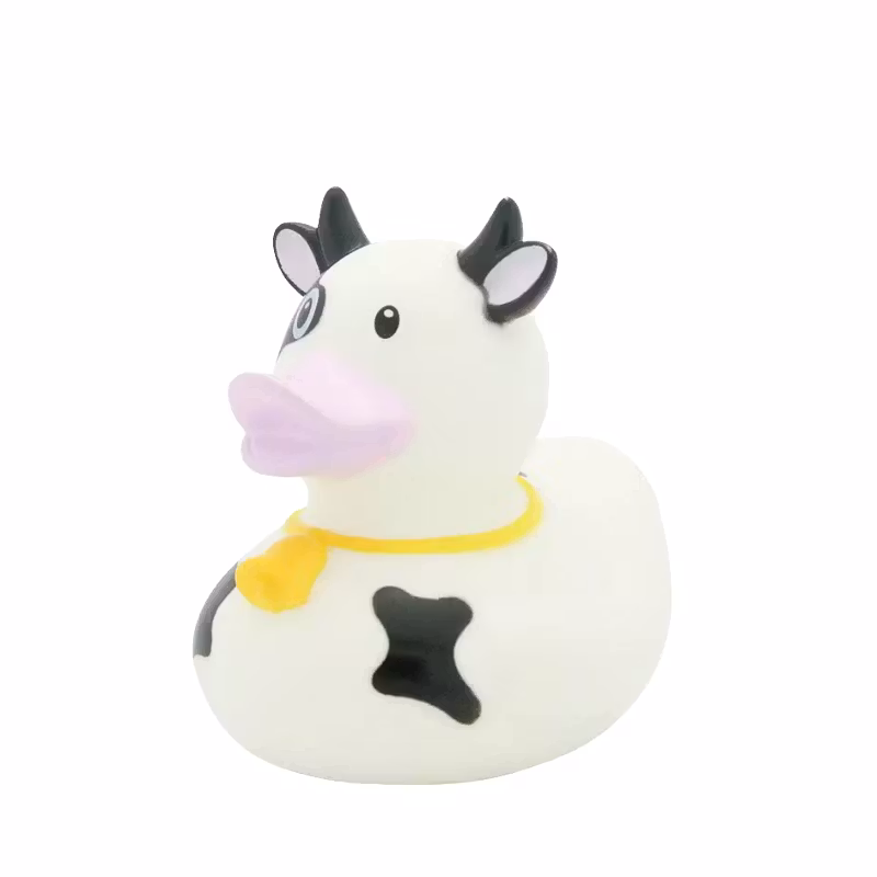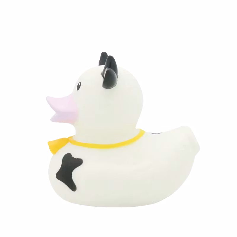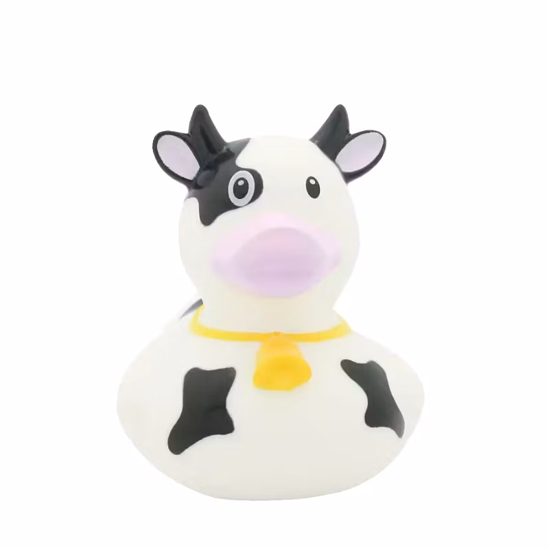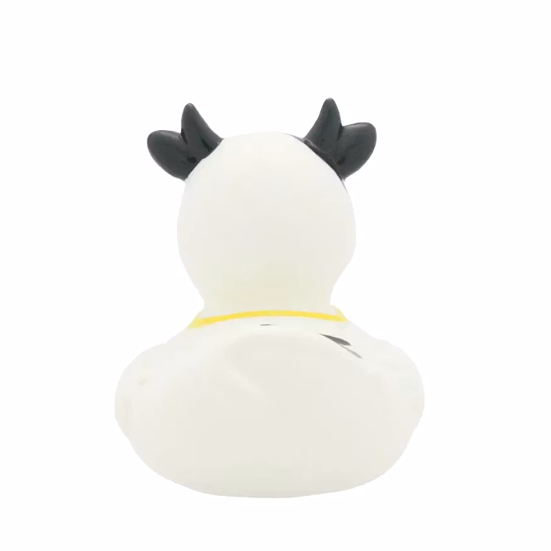 Möt vår underbara badanka Kossan! En söt och charmig badkompis med svartvita fläckar, små horn och ett glatt uttryck – perfekt för både barn och vuxna som vill ha något annorlunda i badet.